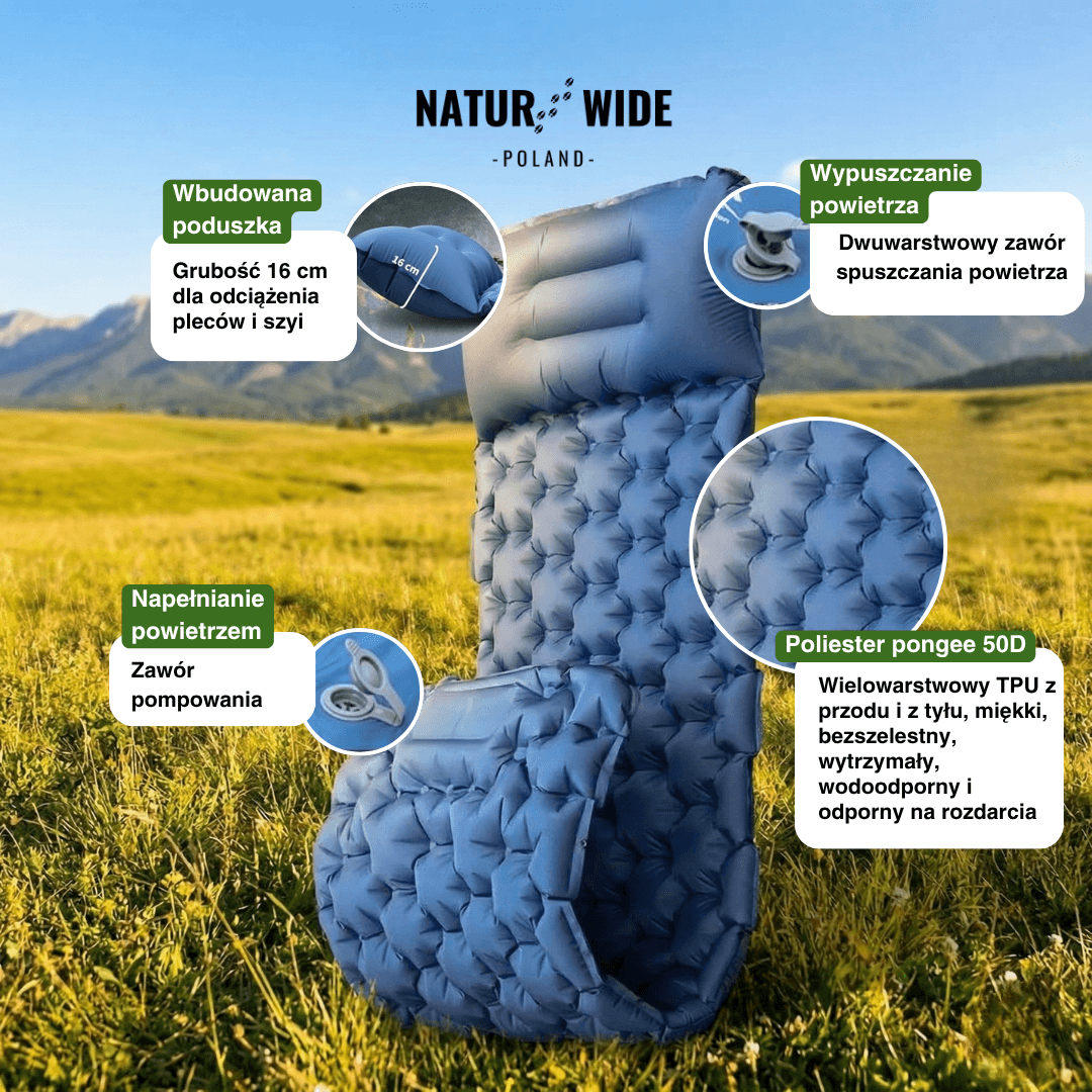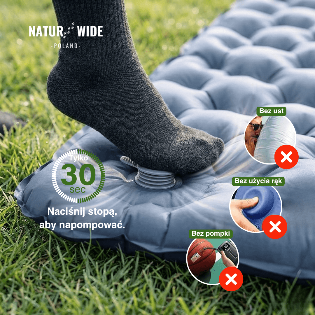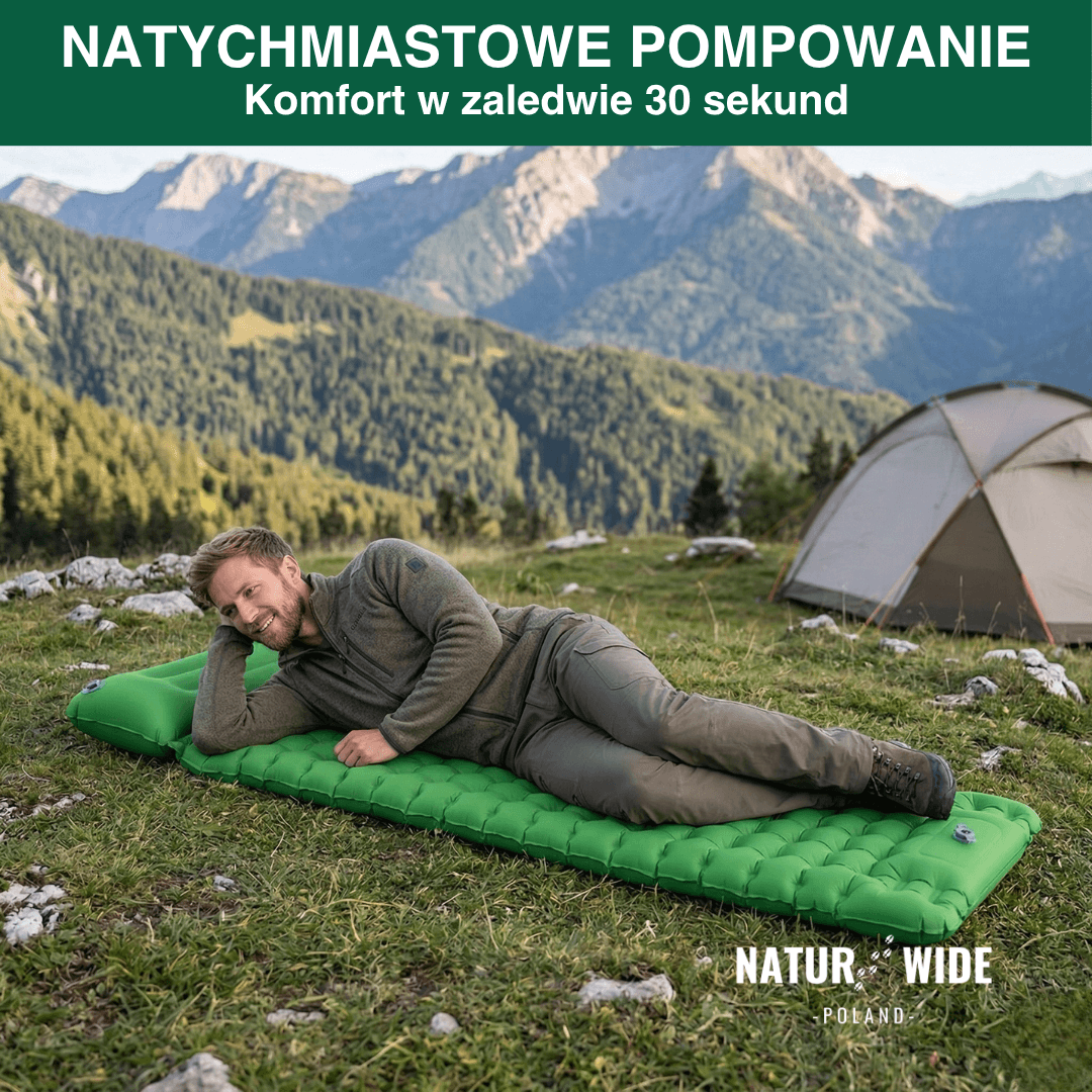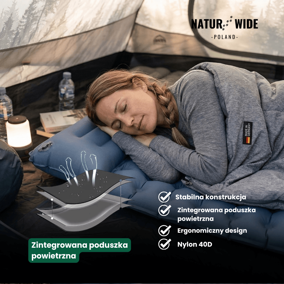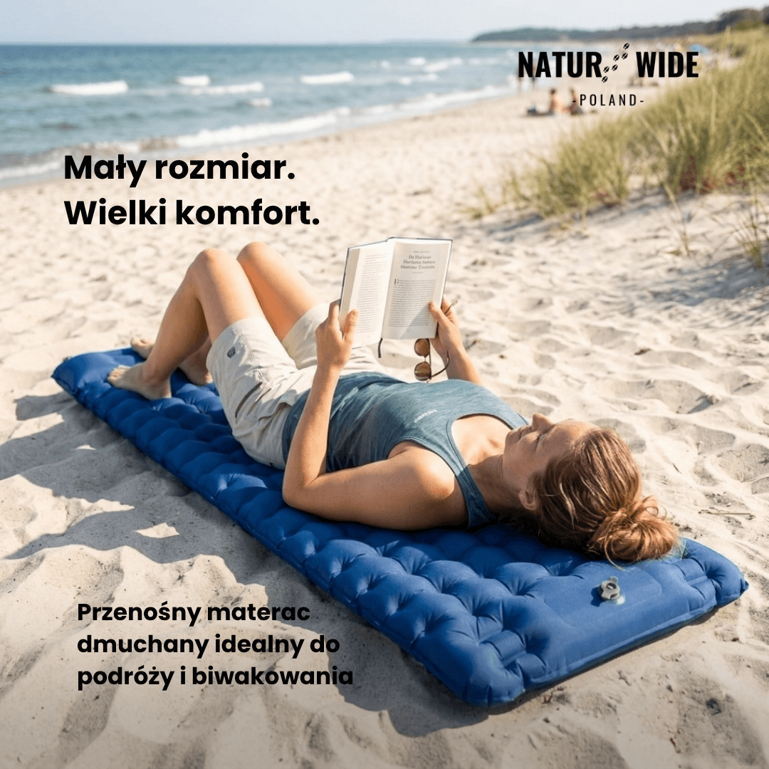 Dobry nocny odpoczynek jest niezbędny po długim dniu wędrówki, jazdy na rowerze lub wspinaczki. Nasz Ultralekki Materac Kempingowy oferuje idealną równowagę między komfortem a przenośnością. Nigdy więcej nie będziesz musiał dźwigać ciężkich i nieporęcznych dmuchanych materaców ani spać na cienkich matach, przez które czujesz każdy kamień pod plecami.