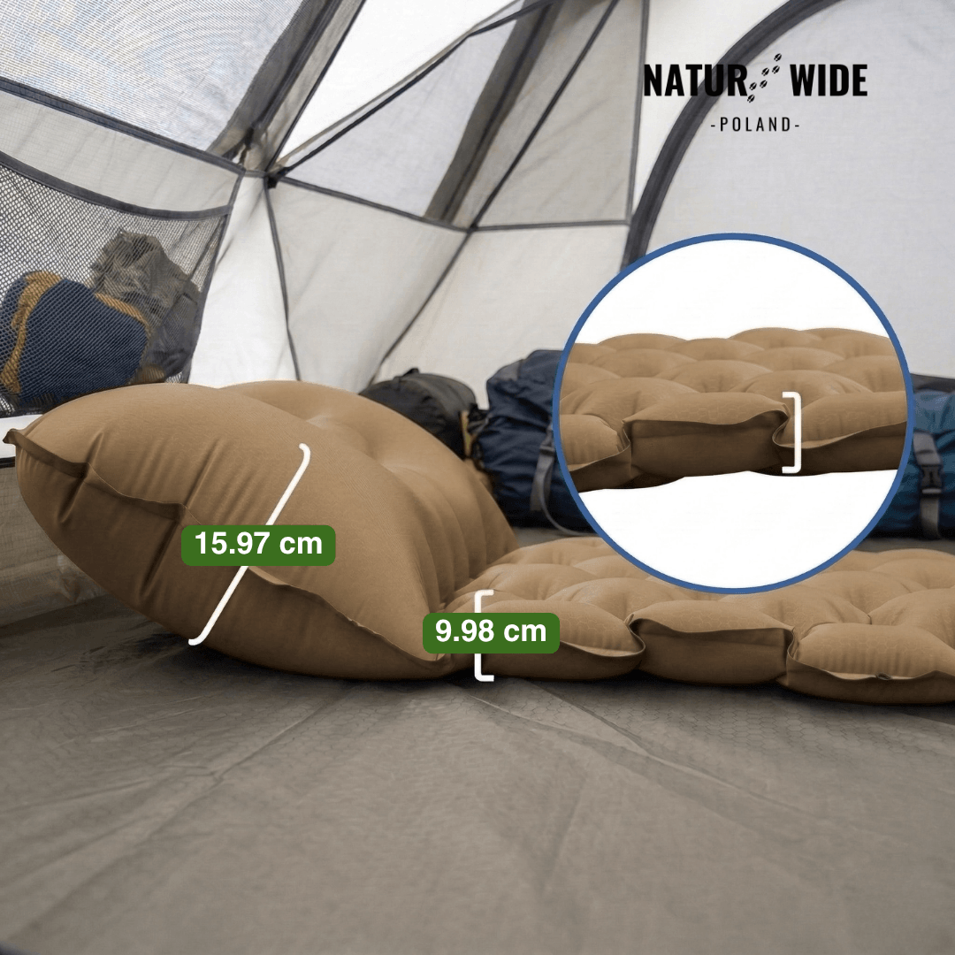 Dzięki innowacyjnemu designowi z komorami materac dopasowuje się do kształtu Twojego ciała. Gwarantuje to optymalne podparcie i skuteczną izolację przed zimnem z podłoża. Materiał wykonany jest z wysokiej jakości, odpornego na rozdarcia nylonu, który wytrzymuje gałęzie i kamienie, a wodoodporna powłoka utrzymuje Cię w pełni suchym nawet przy porannej rosie.